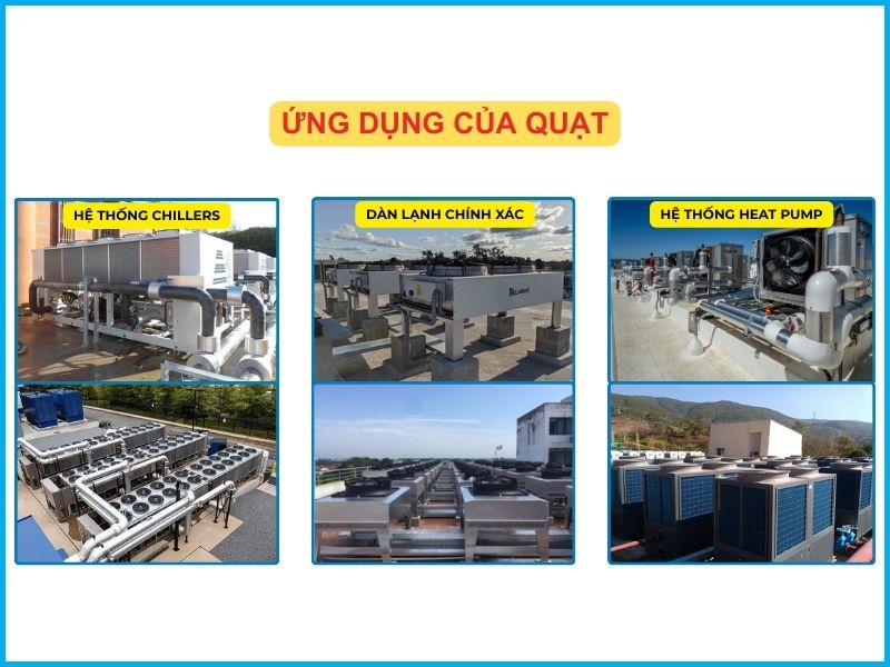 Quạt được ứng dụng rộng rãi trong các hệ thống chillers, heat pump và hệ thống dàn lạnh chính xác, nơi yêu cầu lưu lượng gió lớn, hiệu suất cao và độ tin cậy trong vận hành liên tục.